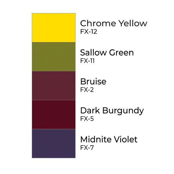 Ben Nye FX Stack offers the most useful selection of effects-specific shades. Replace or add shades as needed to build custom stacks. These shades produce life-like, "in the skin" effects for black eyes, bruises, abrasions, burns, and character details.