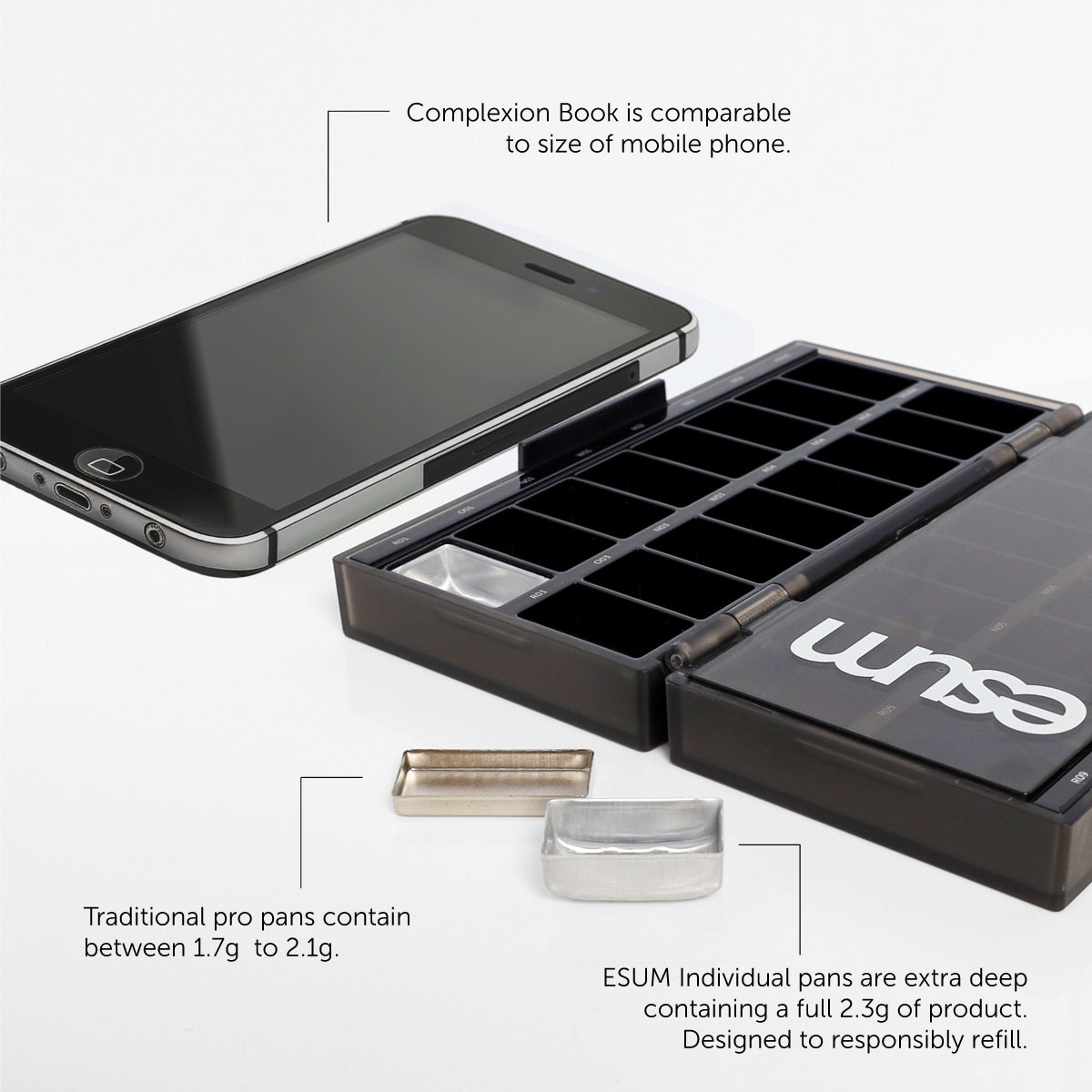 • Eco-Friendly commitment, The ESUM Complexion Book is made from post-consumer recycled materials. It's designed to fit comfortably in the hand, similar in size to a mobile phone, with each shade housed in an extra-deep pan containing a generous 2.3g of product.